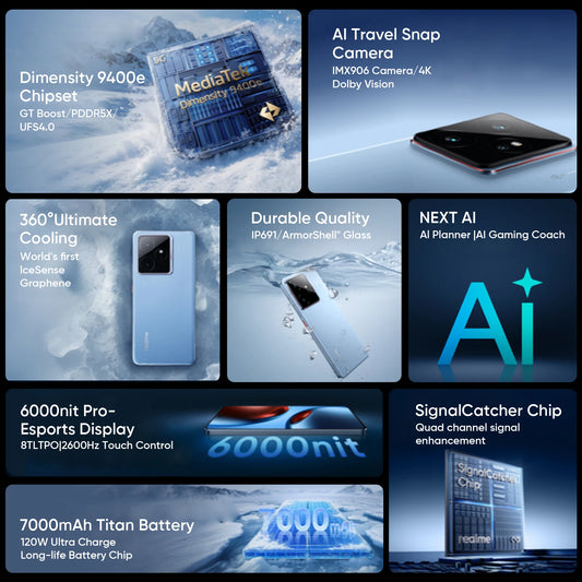 【Brand+】Global Version realme GT 7 5G AI Smartphone MTK Dimensity 9400e 6000nits Pro-Esports Display 7000 mAh Battery